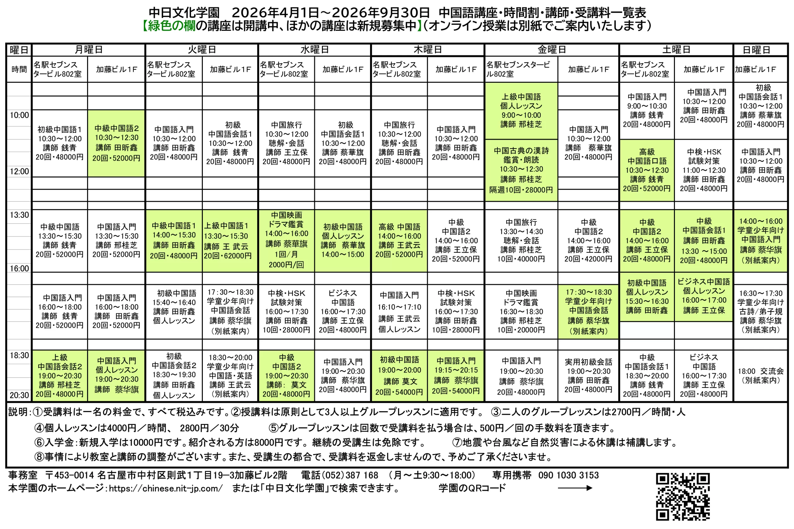 | 短文精読・作文 短文精读・作文 | 歴史物語、人物エッセイ、詩作、作文 (历史故事、人物轶事、诗词、作文) | 70分12回 25,080円 | 月~金(16:00~20:00) 土日(10:00~20:00) |